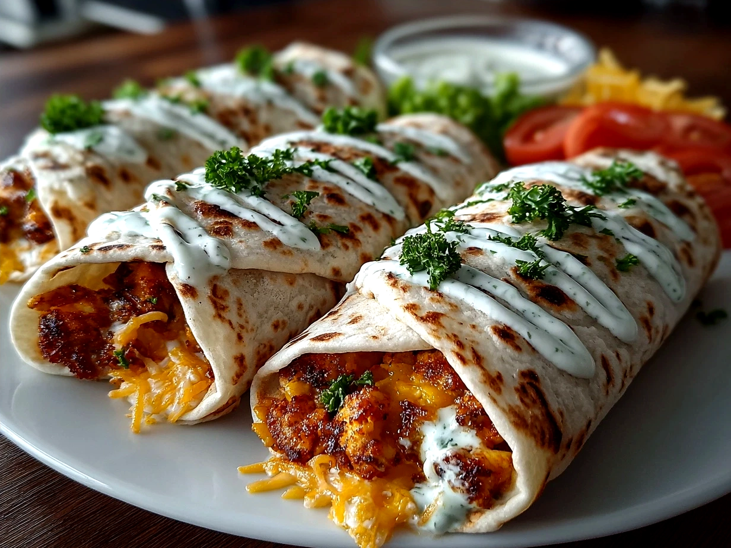 A deliciously served Buffalo Chickpea Wrap with fresh veggies and creamy dressing
