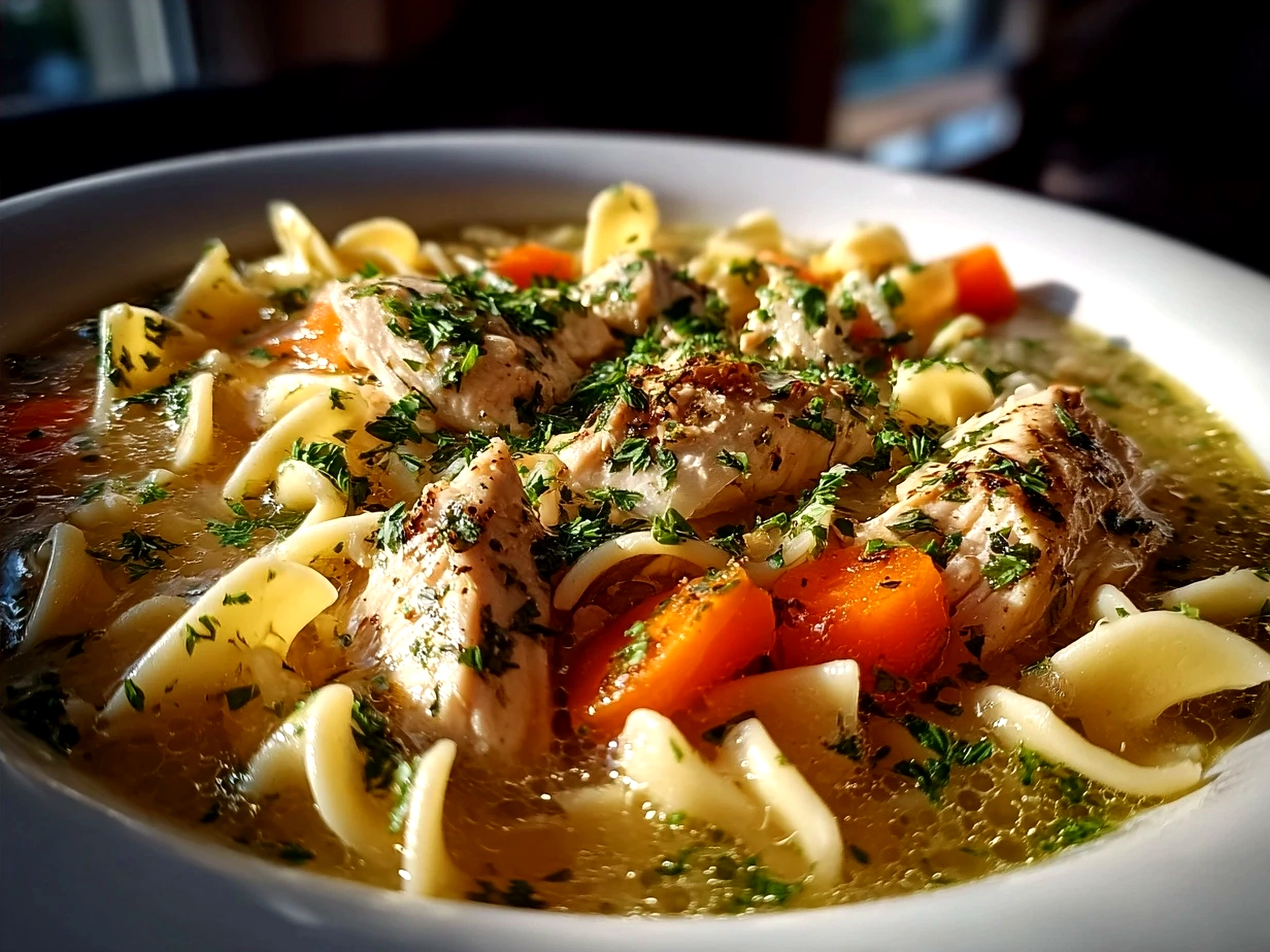 A steaming bowl of homemade chicken noodle soup garnished with fresh herbs, served with crusty bread