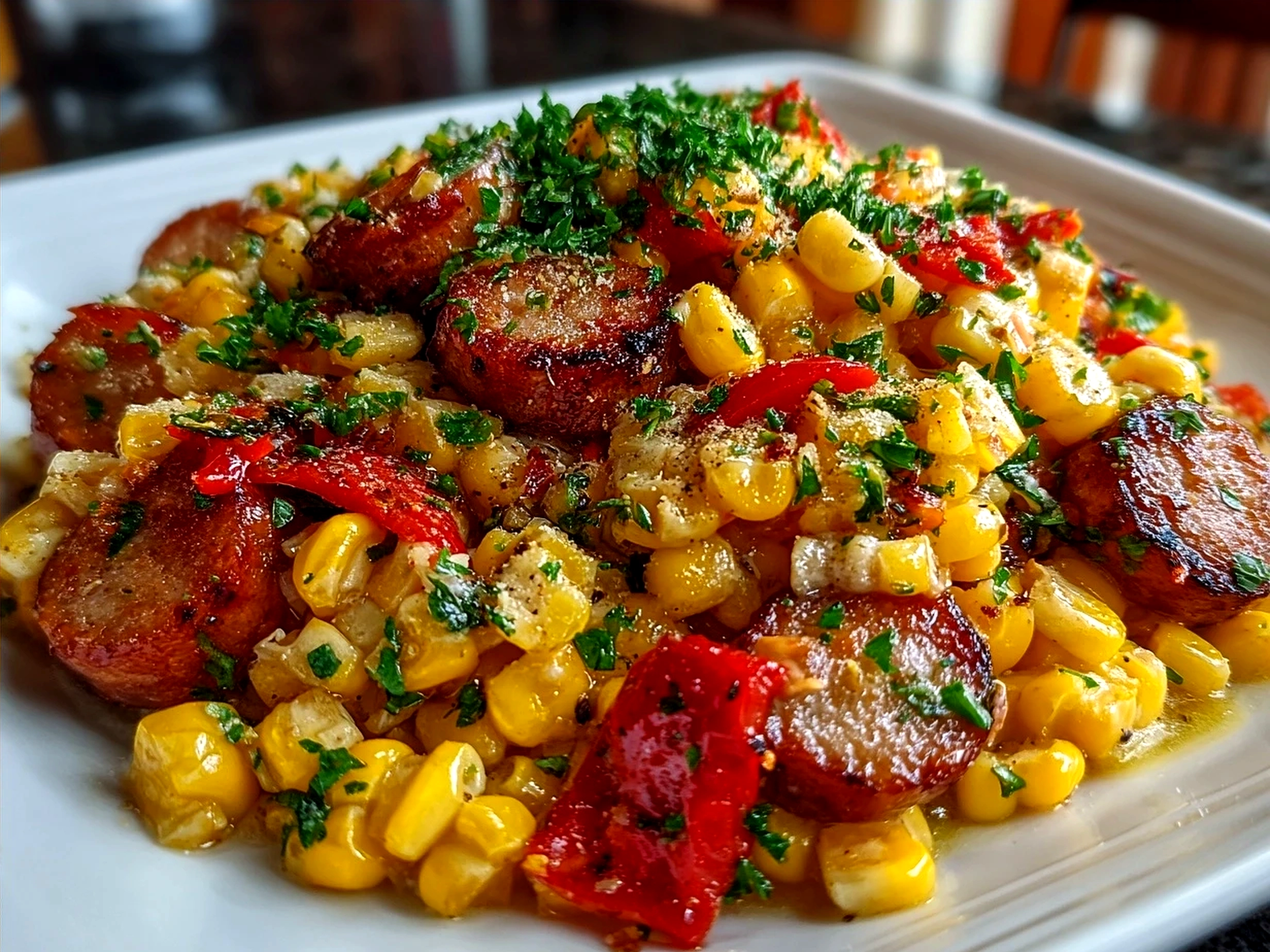 Final plated Maque Choux With Sausage Corn garnished and served