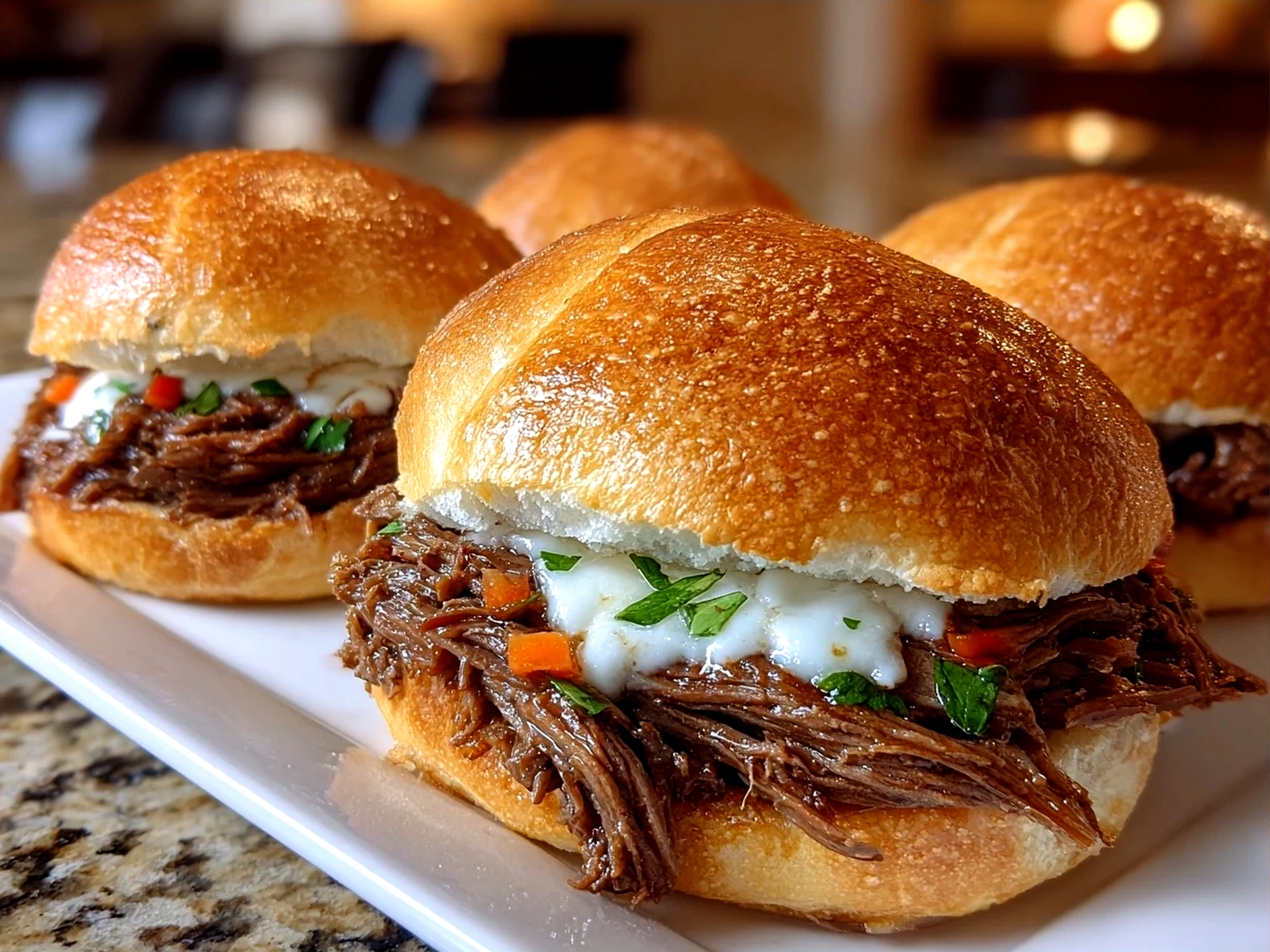 7. Split the rolls and pile the shredded beef onto each bun, topping with provolone if desired.